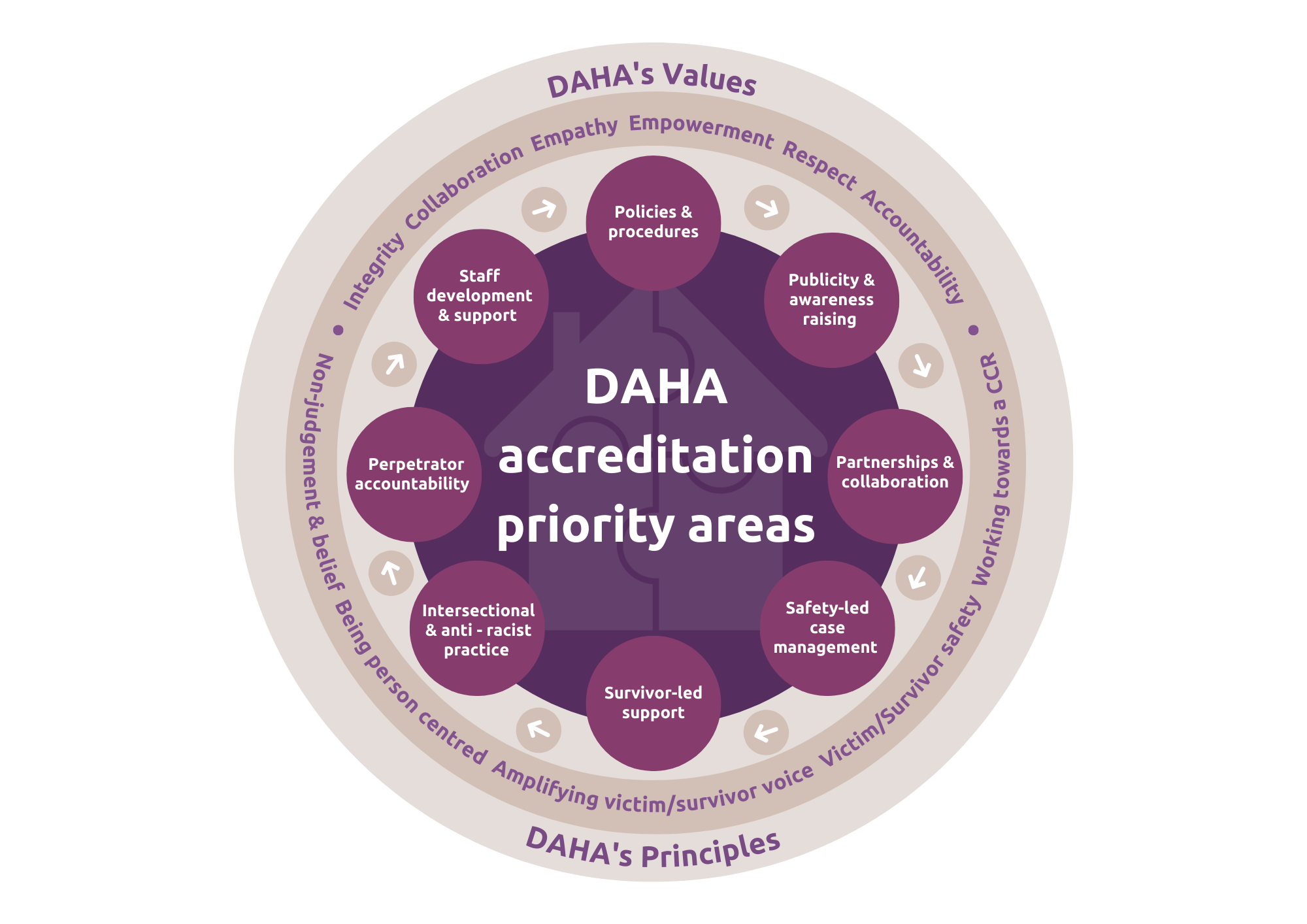 Our accreditation framework includes 8 priority areas that considers an organisation's operations and delivers safe and effective interventions in domestic abuse.